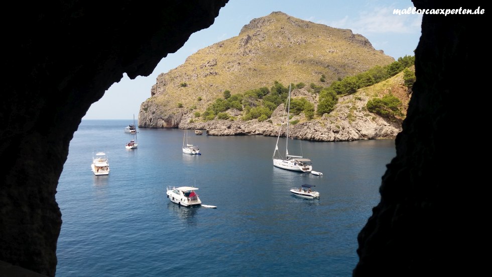 Der Strand des Torrent de Pareis ist auch ein beliebter Ankerplatz für Segelyachten und so schauen wir uns auf dem Rückweg zum Bootsanleger in Sa Calobra die wunderschönen Boote in sagenhafter Kulisse von oben an.